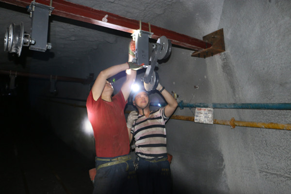 掘一工区为圆满完成矿下达的安装任务,在生产任务重、人员少的情况下,专门抽调了班组技术骨干成立安装小组,严格按照施工技术要求,首先施工了机头机尾的安装平台混凝土基础浇注工作,达到优良等级。32900轨道下山斜坡长度为300多米,“猴车”钢梁安装需要每8米一道,技术要求每道钢梁间必须平行并且保证与巷道帮壁成90度,现场施工和测量放线要求精度高。掘一工区严把技术质量关,根据实际测绘的巷道下山平面及剖面坡度图,在标准允许的情况下参照现场巷道实际情况,及时调整施工措施,最大限度的减少扩帮、卧底。安装小组严格按照地测科标定的安设位置,根据巷道实际情况反复调整,确保了钢梁基础工作的施工质量。在安装横梁的同时,机修人员紧跟安装钢丝绳托架,同步作业,减少了施工时间,尽可能缩短工期,现安装工作顺利进行,已进入最后收尾阶段。
