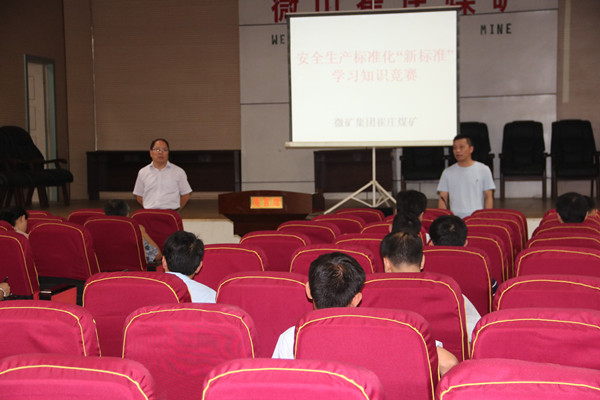 值《煤矿安全生产标准化考核定级办法(试行)》和《煤矿安全生产标准化基本要求及评分方法(试行)》即将试行之际,崔庄煤矿煤矿安全生产标准化“新标准”学习竞赛在职工餐厅二楼会议室举行。来自基层区队的区长、书记、技术员,包括参照区队管理的单位、生产职能科室和行管科室副科级以上干部参加了竞赛活动。
