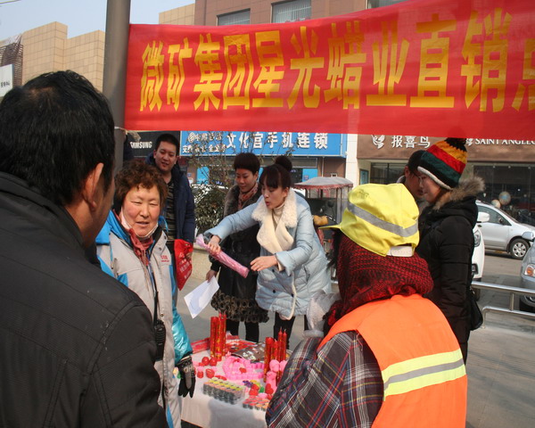 腊月的天气,虽过了立春,仍乍暖还寒。蜡烛推销摊点,蜡业公司的经理、副经理,职能科室负责人,还有不同岗位的女工,他们不顾天气寒冷,现场向市民介绍产品的性能、优点和用途。据了解,由于市场需求紧缩,星光蜡业公司今年的生产经营、减亏增盈任务十分艰巨,为打胜扭亏减亏这场硬仗,他们转变观念,放下架子,积极寻找出路,将拓展市场、扩大销售作为经营管理的重点,带领员工大胆尝试,走上街头向市民推销产品,积累经验,为下步产品开发、市场分析和打开本地市场打基础。参加街头推销的干部员工都说:“我们这次尝试,让市民认识公司的产品,主要是看看自己的产品还存在什么问题,市民需求有什么特点,对我们搞好新产品开发和推动企业发展十分有利。”