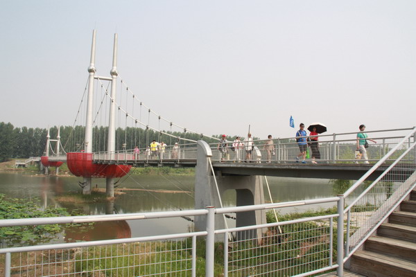 吊桥周身白色,中间两处点缀鲜艳的红色,在青山绿水间,显得格外抢眼。吊桥横跨湖面,与不远处的木栈桥遥相呼应,两种不同的桥体设计凸显了中国文化的古典美和现代美。在吊桥河道两边,分别建设了浅水位鱼塘区和科普植物展示区,浅水位鱼塘区能够让游客在欣赏美景的同时体验摸鱼的乐趣,科普植物展示区向游客展示了亚洲最大的草甸型湖泊湿地丰富多样的植被资源和生态美。