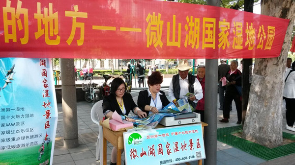 湿地景区在此次旅游宣传活动中,采取了打横幅、制作宣传版面、发放宣传单页、现场介绍景区景点的方式,向公众展示了湿地景区近年来的发展与变化,并在现场对公众开放办理湿地景区游览年卡和文明旅游倡议签字等活动,吸引了广大群众参与,取得了良好的宣传效果。