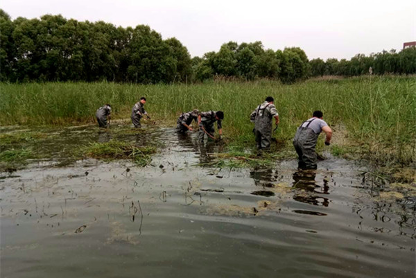 位于湖岸广场的精品荷园是重点开发的景点之一,5月以来,新发的荷叶已经慢慢露出水面,然而大片的芦苇对荷花的生长造成了影响。湿地公司组织人员穿上皮衩,带上镰刀对芦苇进行收割,以期给游客带来更好的游览体验。
