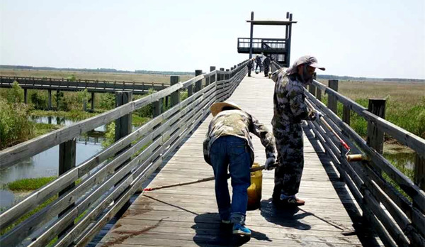 与此同时,赴高楼湿地景区开展木栈道刷漆维护工作的另一路也在紧锣密鼓的进行。高楼湿地景区拥有数千米的木栈道,可以说任务重、时间紧。湿地员工克服路途遥远、交通不利、就餐不便等困难,每日早8点赶赴高楼开始工作,头顶烈日,一直到下午5点多才乘船返回,一天下来衣服不知被汗水浸湿多少次,大家埋头苦干,毫无怨言,用实际行动展示了湿地员工的精神面貌。