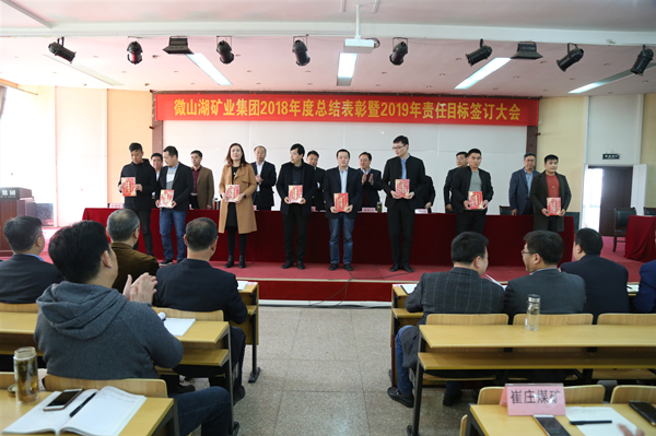 集团公司党委副书记、副董事长、总经理贾凤君分别与欢城煤矿、崔庄煤矿、泗河煤矿、永胜煤矿、酒业公司、纺织公司、热电公司、三产部、生态农业公司的主要负责同志签订了2019年度目标管理责任书;欢城煤矿、崔庄煤矿、永胜煤矿、酒业公司、热电公司、集团公司办公室、三产部单位负责同志分别作了表态发言。