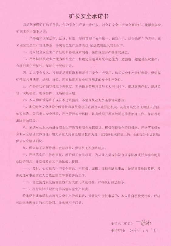 欢城煤矿矿长安全承诺书