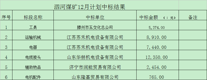 招标结果:微山湖矿业集团(泗河煤矿)12月材料采购招标