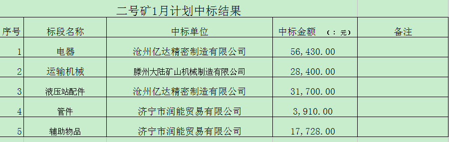 招标结果:微山湖矿业集团(二号井)1月材料采购招标