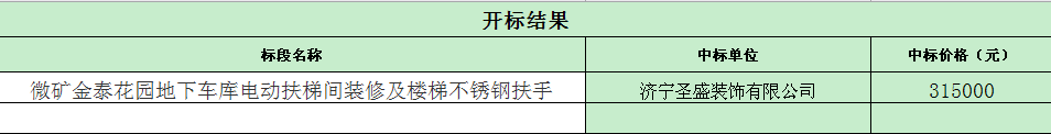 招标结果:微矿金泰花园地下车库电动扶梯间装修及楼梯不锈钢扶手